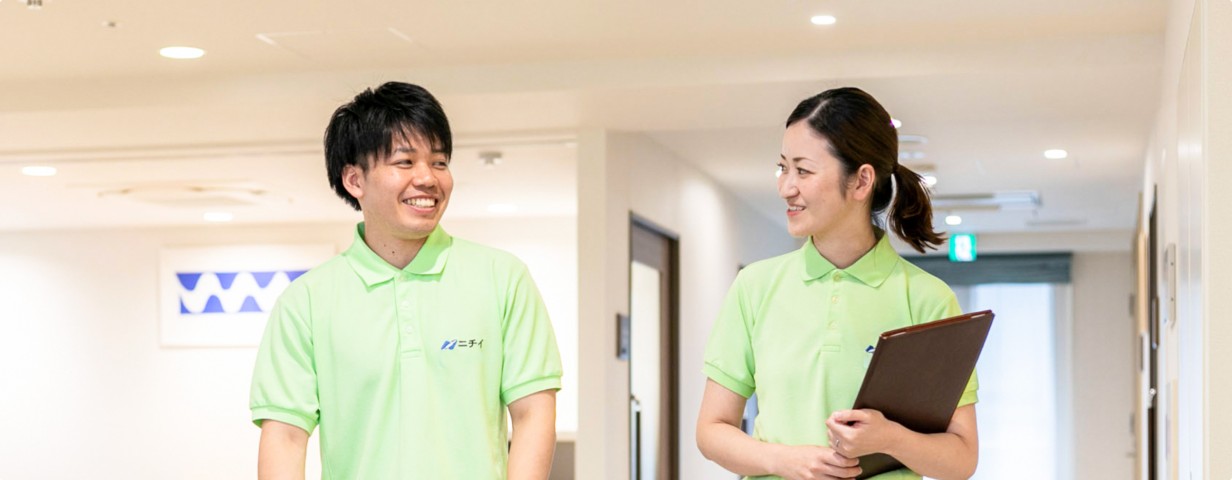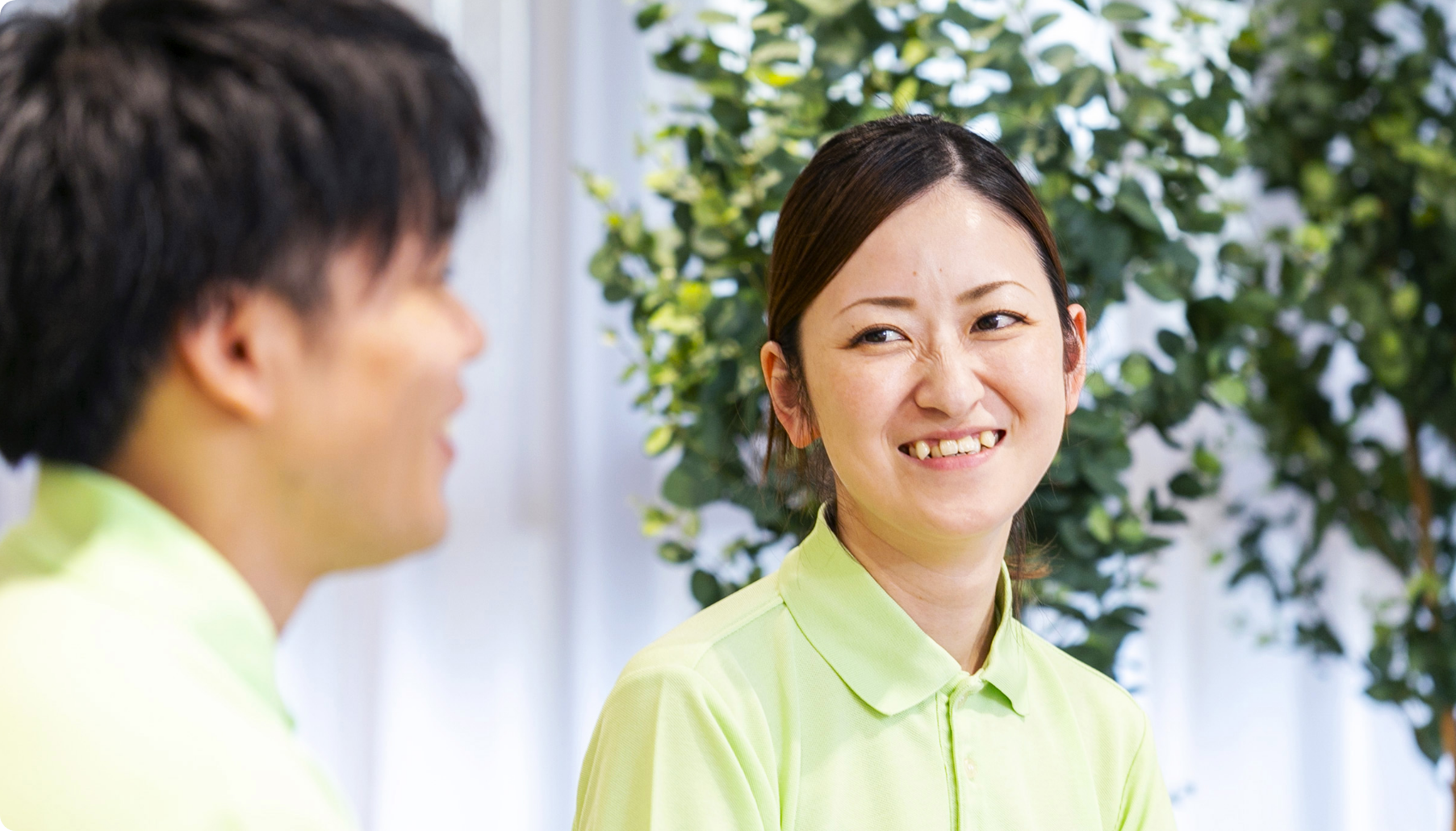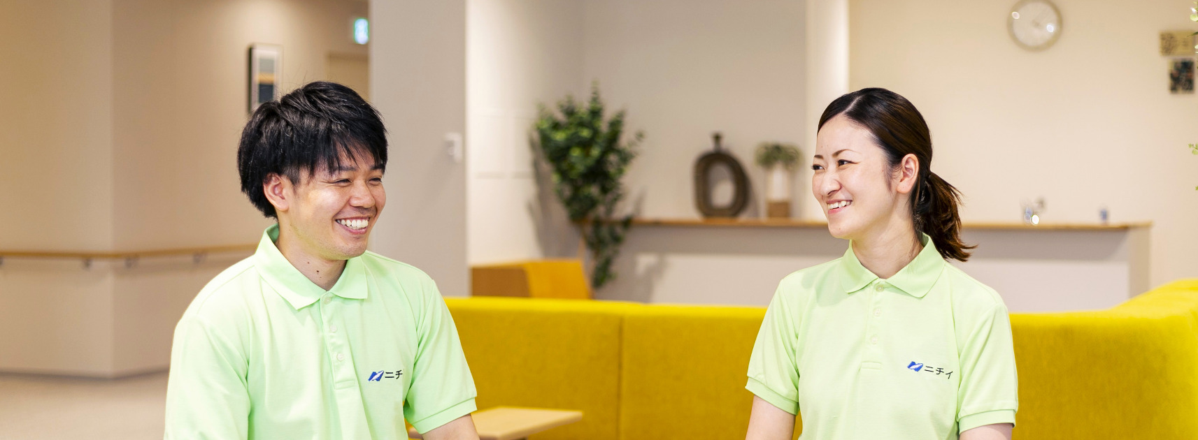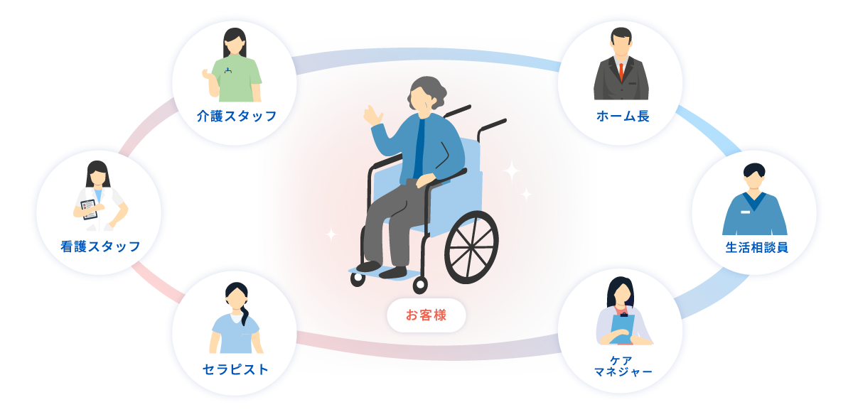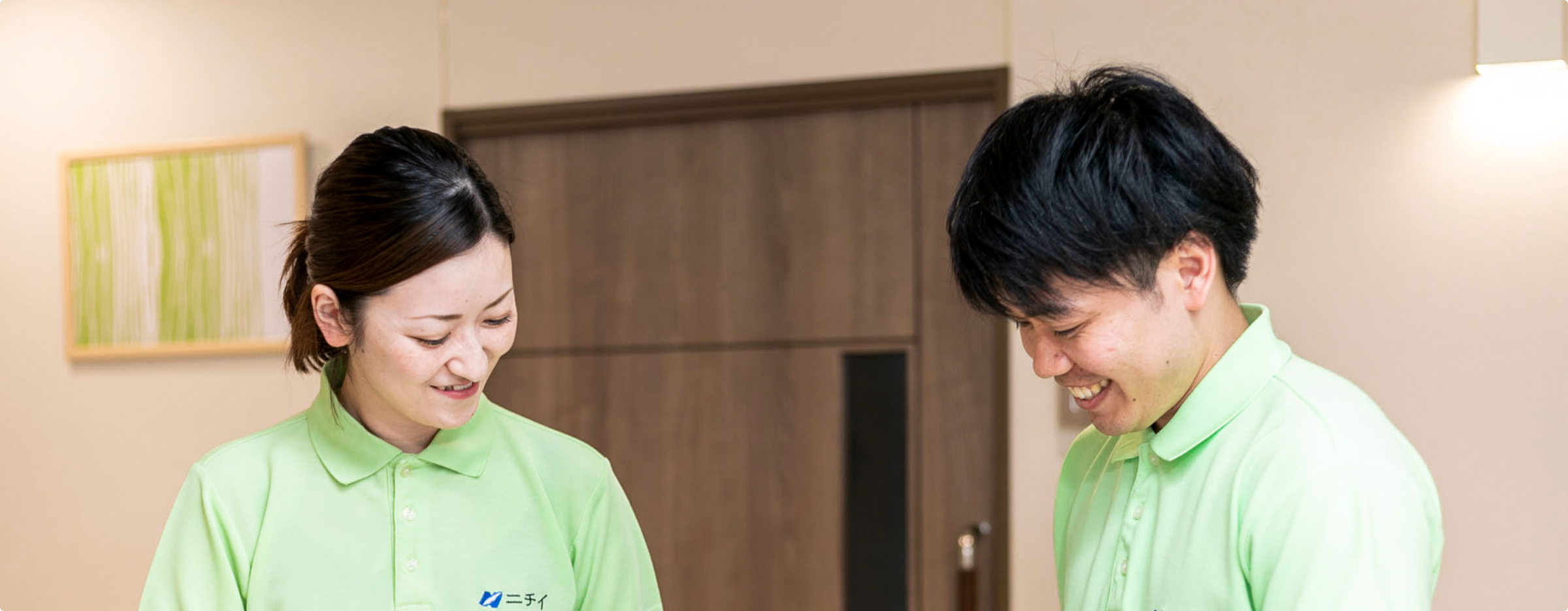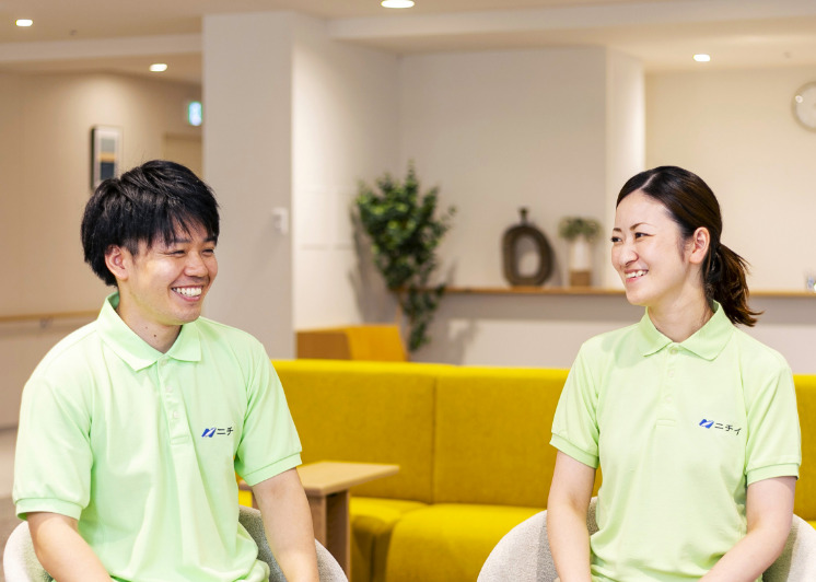 介護はひとりで行うものではありません。ニチイケアパレスでは、介護職・看護師・ケアマネジャー・ホーム長など、さまざまな立場のスタッフが力を合わせてお客様と向き合う「チームケア」を大切にしています。同じホームで働く2人に、チームケアについて語ってもらいました。